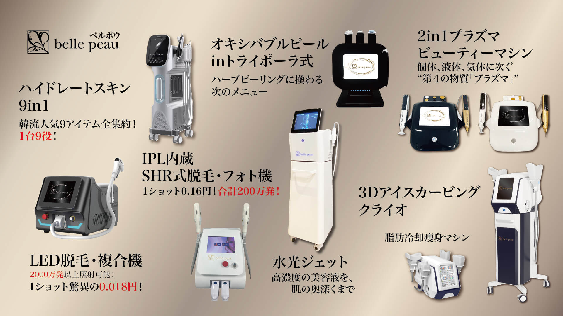 サロン用の脱毛機などお取り扱い機器を紹介しています。